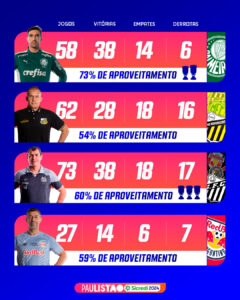 O perfil oficial do Paulistão compartilhou no Instagram uma lista de aproveitamento no estadual entre os quatro técnicos semifinalistas da competição. O líder sem muitas surpresas é o comandante do Palmeiras, Abel Ferreira. Tendo sido finalista, e ganhando dois títulos entre as três edições que disputou da A1, seu aproveitamento atual é de 73%. Em 58 jogos disputados são 38 vitórias, 14 empates e 6 derrotas.