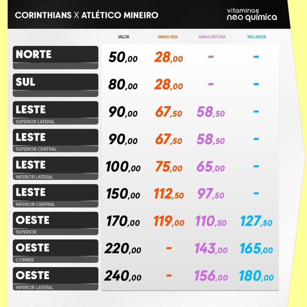 Valores dos ingressos para a partida contra o Atlético – Imagem: Divulgação/Corinthians