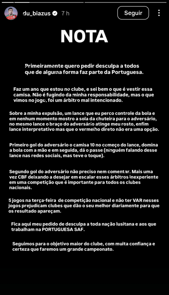 Biazus também reclamou da ausência do árbitro de vídeo na fase da competição e cobrou mais cuidado da organização em jogos de mata-mata nacional. Mesmo com o tom de revolta, o defensor encerrou a nota reforçando o pedido de desculpas à torcida da Portuguesa e afirmando que o elenco segue focado no principal objetivo do clube na temporada.