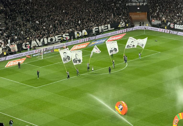 No gramado do estádio de Itaquera, o Corinthians expôs bandeiras com os rostos e nomes dos atletas campeões mundiais – veja na imagem acima. Além disso, os telões do estádio também exibiram vídeos de lances da conquista, dando destaque para as disputas de pênalti, em que Dida brilhou e garantiu o título.
