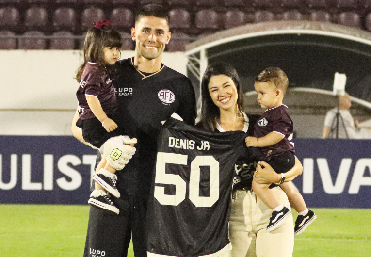 Foto: Guilherme Moro/Ferroviária SAF O goleiro Dênis Júnior foi homenageado pela Ferroviária antes da partida contra o Sertãozinho, na última quarta-feira, após alcançar a marca de 50 jogos com a camisa grená. O reconhecimento aconteceu no gramado, com a entrega de uma camisa comemorativa feita pelo diretor-presidente Júlio Carneiro.
