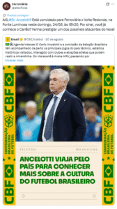 A Ferroviária aproveitou o burburinho em torno da agenda do técnico da Seleção Brasileira, Carlo Ancelotti, e lançou um convite inusitado para a partida contra o Volta Redonda, pela 23ª rodada da Série B. A iniciativa, publicada com tom bem-humorado nas redes sociais do clube, também teve como objetivo promover o atacante Carlão, artilheiro da equipe na competição com oito gols e vice-líder de goleadores da Série B.