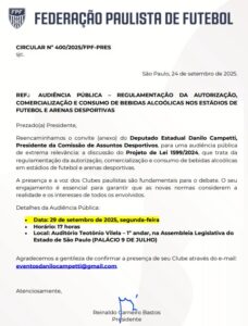 Foto: Bruno CassucciA Federação Paulista de Futebol (FPF) encaminhou aos clubes do estado um convite para participar de uma audiência pública de grande importância. O encontro vai debater o Projeto de Lei 1599/2024, que propõe regras para a autorização, comercialização e consumo de bebidas alcoólicas em estádios de futebol e arenas desportivas.