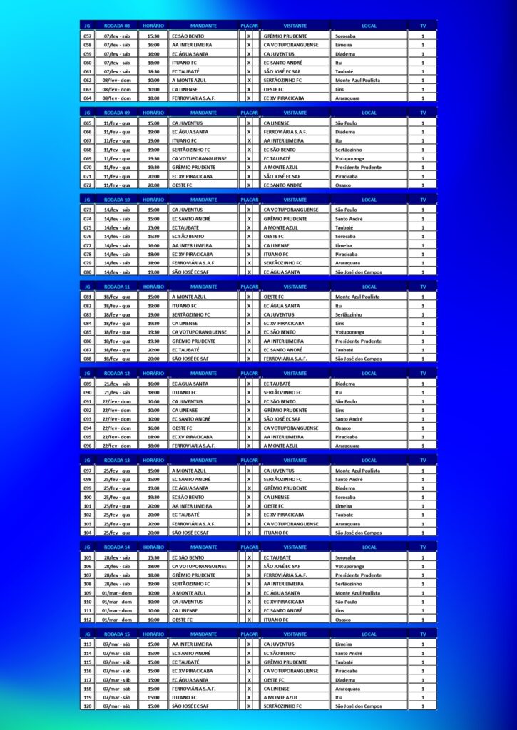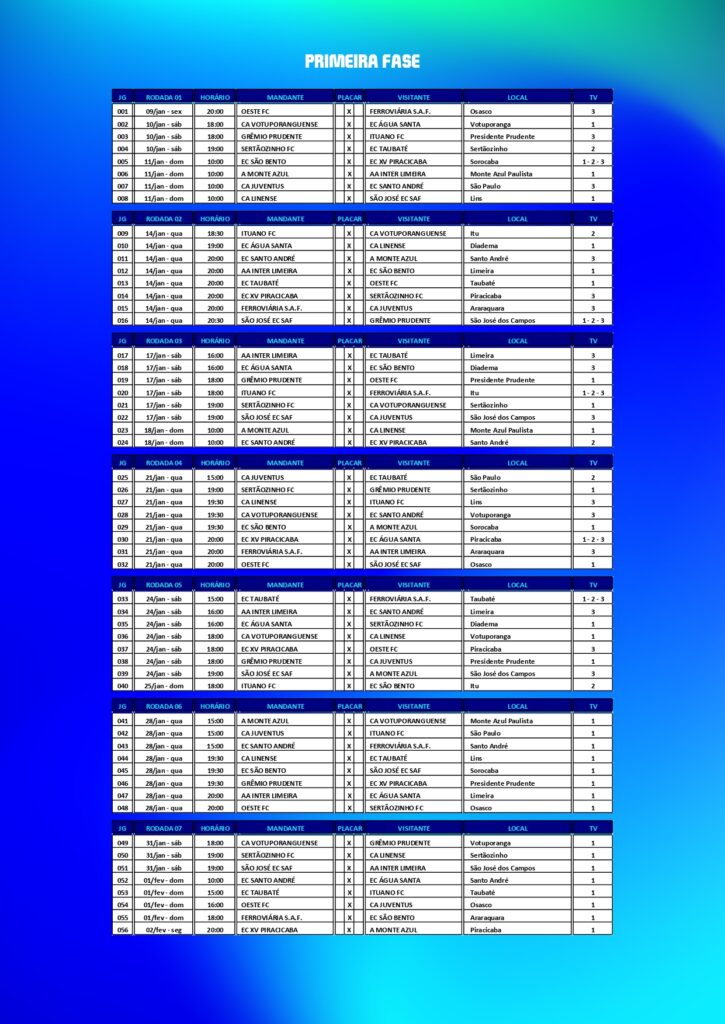 Foto: Divulgação/FPFA Federação Paulista de Futebol divulgou a tabela detalhada do Paulistão A2 2026, que começa no fim de semana de 11 de janeiro e terá a final marcada para 13 de maio. A competição deste ano chega com a implementação de quadrangulares na segunda fase, etapa que antecederá as semifinais que definirão os dois clubes promovidos à elite do futebol paulista de 2027.