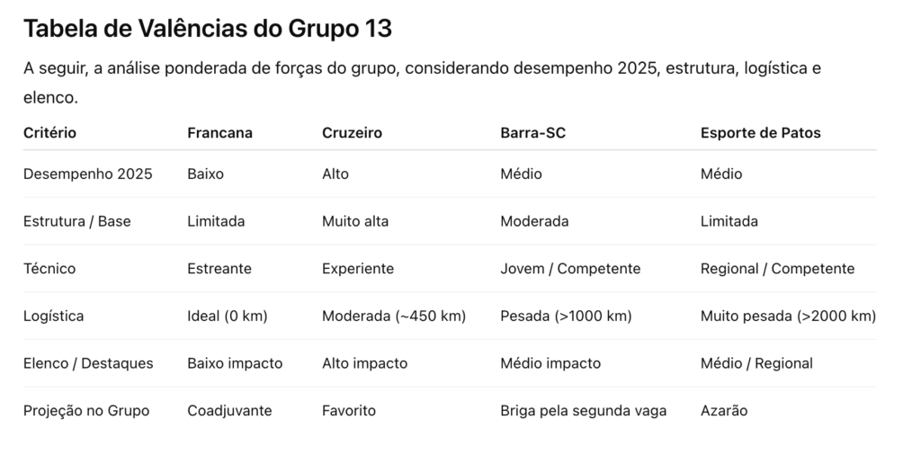O Grupo 13 apresenta uma hierarquia técnica clara, mas não definitiva. O Cruzeiro desponta como favorito natural pela consistência e profundidade da base. O Barra-SC surge como principal concorrente à segunda vaga, embora tenha de superar longo deslocamento. A Francana, mesmo tecnicamente inferior, carrega o fator sede como trunfo, enquanto o Esporte de Patos chega embalado por título estadual, mas carrega enorme desafio logístico.