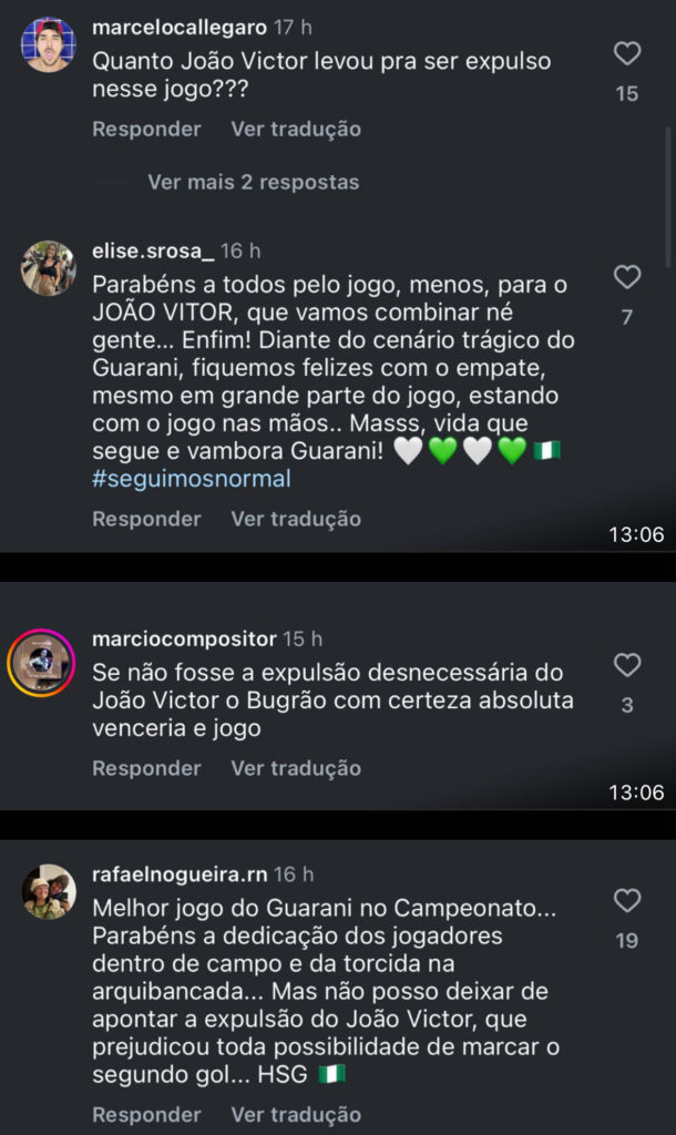 Em suas redes sociais, o atleta se manifestou sobre o ocorrido, demonstrando seu carinho pelo time e reconhecendo o erro. “Não é segredo para ninguém o imenso carinho que tenho por esse time, é uma honra para mim vestir essa camisa ainda mais sendo de Campinas. Sei do tamanho desse jogo, me concentrei ao máximo e acabei pecando pelo excesso de vontade. Gostaria de me desculpar com a instituição, meus companheiros e principalmente com a nação bugrina que veio nos prestigiar no jogo de ontem.” A postagem, feita no Instagram do jogador (@joaovictorferreira), gerou diversos comentários de apoio e compreensão por parte dos torcedores.