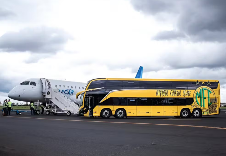 Foto: Pedro ZacchiO Mirassol novamente utilizou o avião da empresária e presidente do Palmeiras, Leila Pereira, para a viagem até a Baixada Santista, onde a equipe enfrenta o Santos nesta quarta-feira, às 21h30, pela 34ª rodada do Brasileirão. O deslocamento até a Vila Belmiro aconteceu na tarde desta terça-feira, partindo do aeroporto estadual Professor Eribelto Manoel Reino, localizado em São José do Rio Preto, cidade vizinha ao município mirassolense.