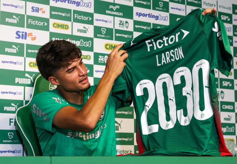 O Palmeiras anunciou nesta terça-feira (27) a compra do meio-campista Larson. O jovem, de 20 anos, assinou em definitivo com o Verdão até o fim de 2030.