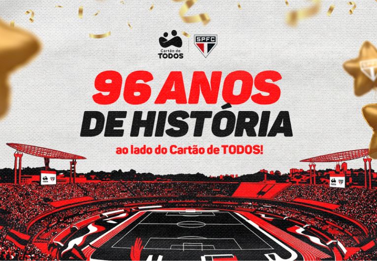 Foto: Divulgação O Cartão de TODOS celebra os 96 anos do São Paulo presenteando seus filiados com 48 pares de ingressos para duelos no MorumBIS. Após a primeira remessa destinada ao jogo contra a Portuguesa, a iniciativa reforça a parceria com o clube e oferece benefícios exclusivos aos membros do maior cartão de descontos do país em meio às comemorações de aniversário do Tricolor.