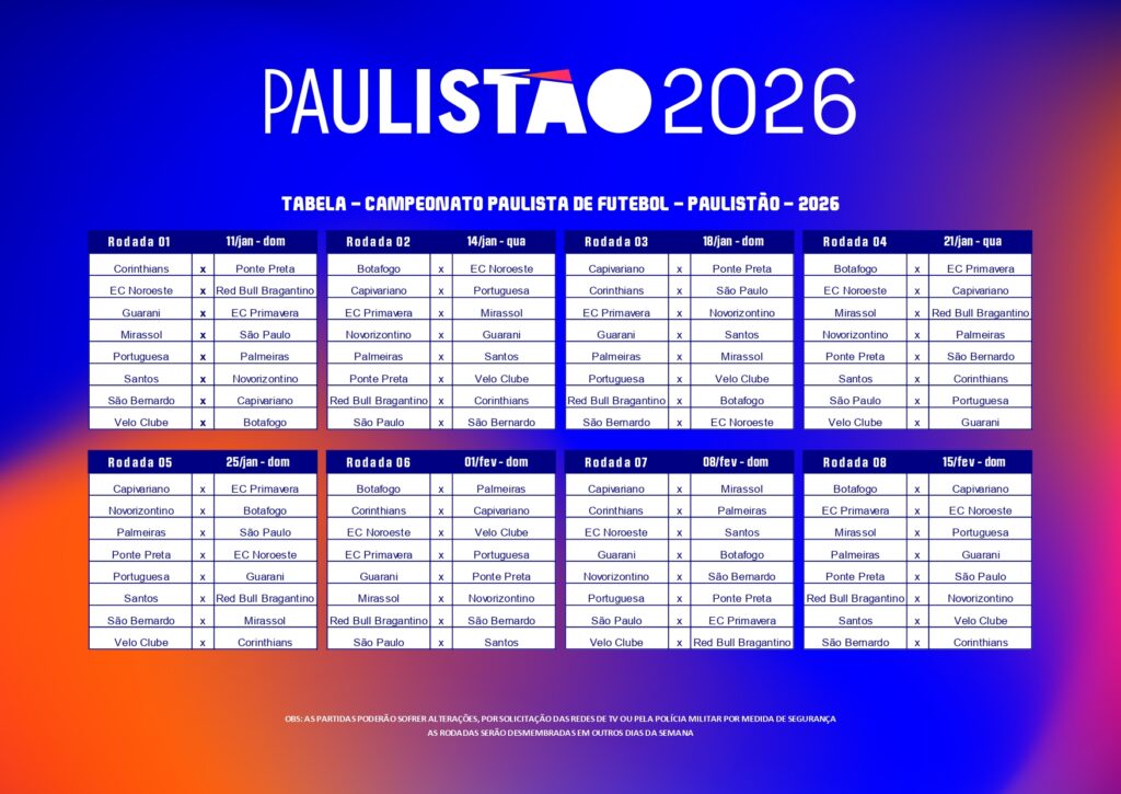 Na noite desta quinta-feira, 27, a Federação Paulista de Futebol (FPF) divulgou a tabela básica da primeira fase do Paulistão A1. Com o novo calendário imposto pela Confederação Brasileira de Futebol (CBF), a competição terá até 12 datas, exigindo um novo formato.