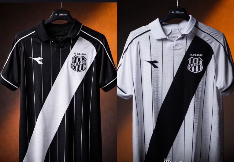 Foto: PontePress A Ponte Preta apresentou oficialmente os uniformes que utilizará na temporada 2026. Os novos modelos, nas versões branca e preta, preservam a identidade histórica do clube com a tradicional faixa diagonal no peito, além de detalhes em listras que complementam o visual das camisas.