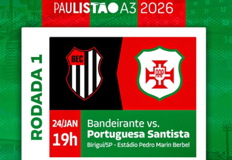 A Portuguesa Santista já conhece data, horário e local de sua estreia no Campeonato Paulista da Série A3 de 2026. A Briosa entra em campo no sábado, 24 de janeiro, às 19h, diante do Bandeirante, no Estádio Pedro Marin Berbel, em Birigui.