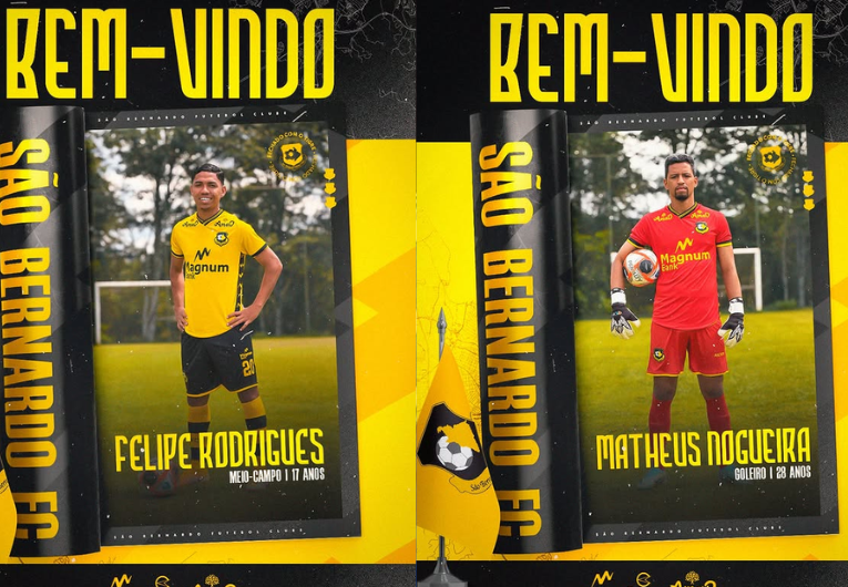 O São Bernardo oficializou mais dois reforços para a temporada 2026. O goleiro Matheus Nogueira e o meia Felipe Rodrigues reforçam o Bernô para as disputas do Paulistão, Copa Sul-Sudeste, Copa do Brasil e Brasileirão Série B.