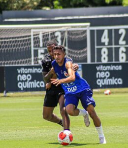 Clevinho em disputa de bola no jogo treino contra o Corinthians
