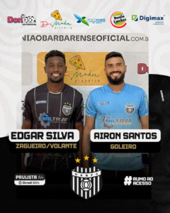 Foto: Divulgação / Airon SantosVisando a segunda fase do Paulistão A4, o União barbarense apresentou nesta quarta-feira mais 2 reforços para compor o elenco e ajudar no mata mata. Trata-se do zagueiro e volante Edgar Silva e do goleiro Airon Santos.