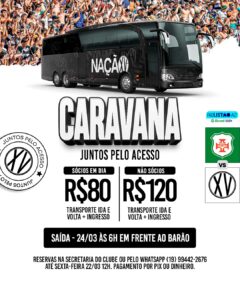 A diretoria do time está organizando uma caravana para Santos, em busca do acesso. Com os valores a partir de R$80,00 para sócios torcedores e R$120,00 para não sócios, o preço inclui as passagens de ida e volta, juntamente com o ingresso para a partida. E ficará disponível para compra até o 12h de hoje (22), sendo possível efetuar o pagamento através de pix ou dinheiro.